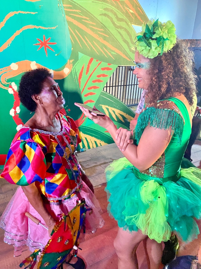 Logo na entrada fomos recebidas por alguns dos patrimônios vivos do Recife homenageados no baile: a Tribo de Caboclinhos Tupi, o Bloco Carnavalesco Misto Pierrot de São José e a incansável passista Zenaide Bezerra, 74 anos e com o Carnaval correndo nas veias desde os oito. “Dançava com meu pai, Egídio Bezerra, desde os 8 anos. Me emocionei hoje abrindo o baile, um evento especial que me lembra muito dele”. Se Zenaide brilha no Carnaval do Recife, no restante do ano ela se dedica a ensinar tudo o que sabe para jovens, de graça, em sua casa no bairro da Madalena. “Meus alunos se apresentam comigo aonde for”, conta.