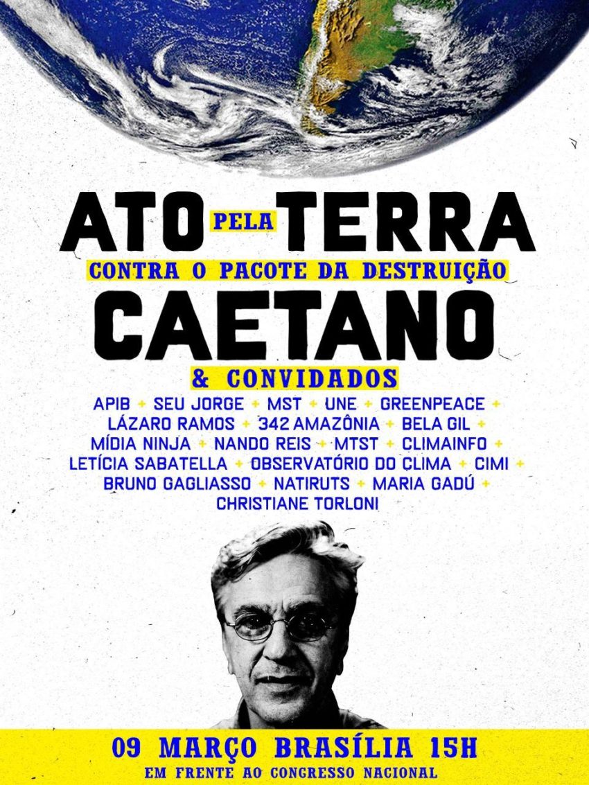 Atentos à essa realidade, artistas organizam manifestação em defesa da terra em parceria com organizações e movimentos da sociedade civil convocam a população brasileira para se reunir em um grande Ato em Defesa da Terra, no dia 09 de março, em frente ao Congresso Nacional, em Brasília.