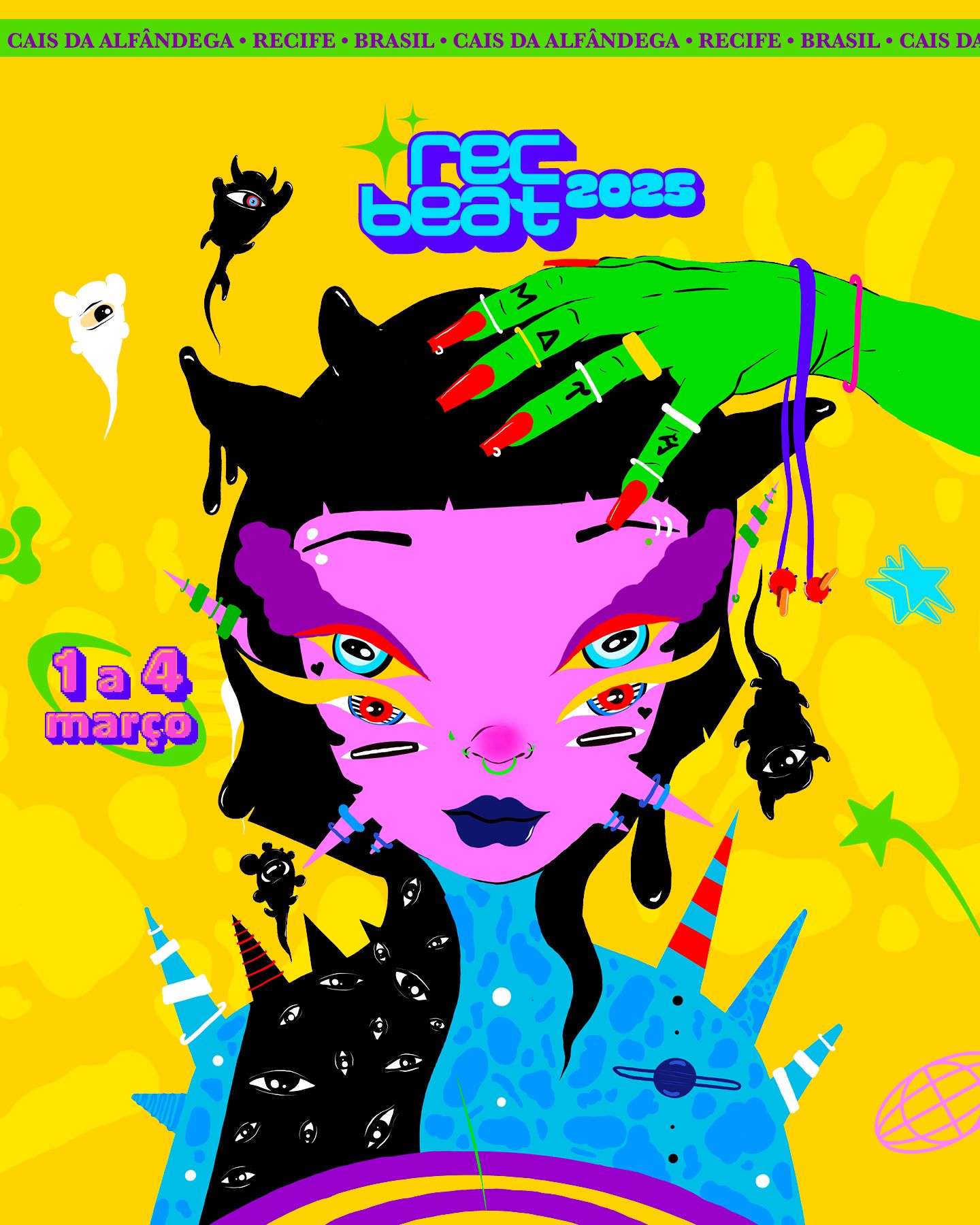 “A personagem possui uma aura surreal, misturando elementos humanos. Uma mão verde, com unhas vermelhas e anéis representa a música possuindo seu corpo”, diz Mari sobre a obra criada exclusivamente para o Rec-Beat 2025.